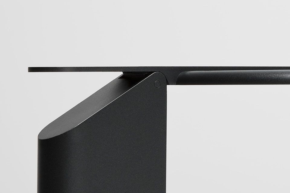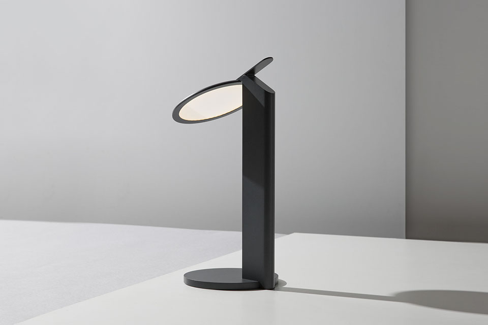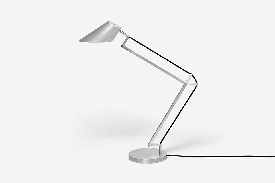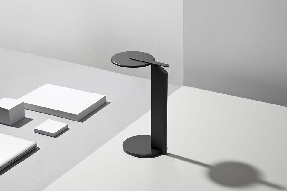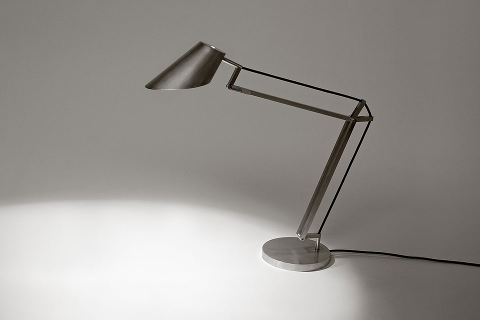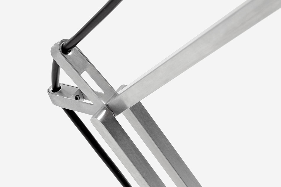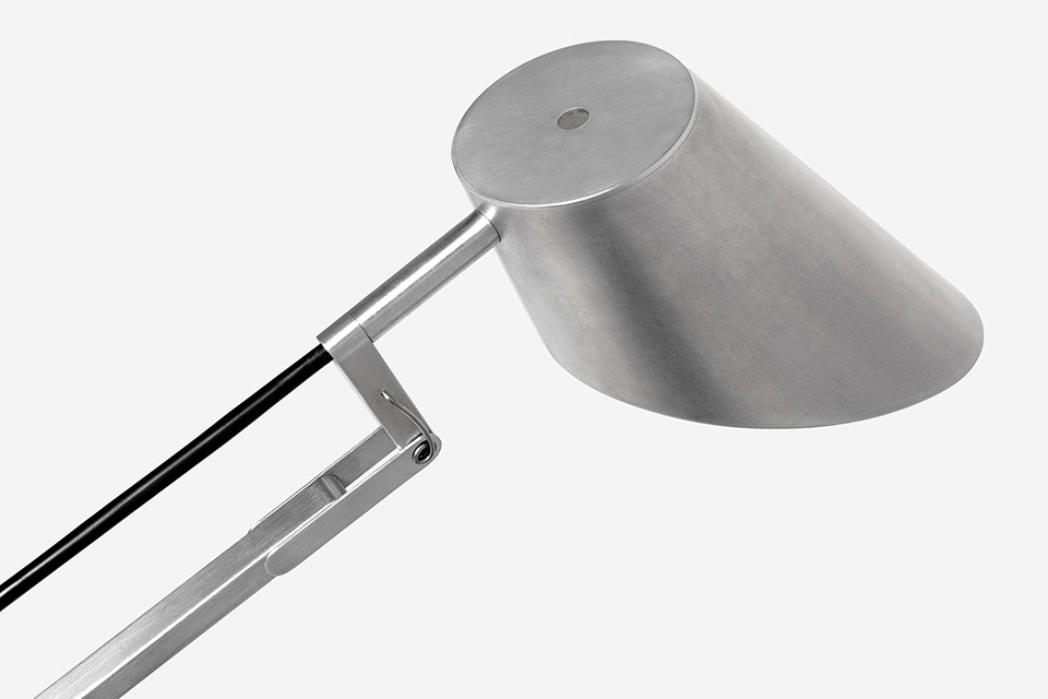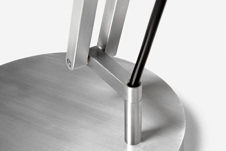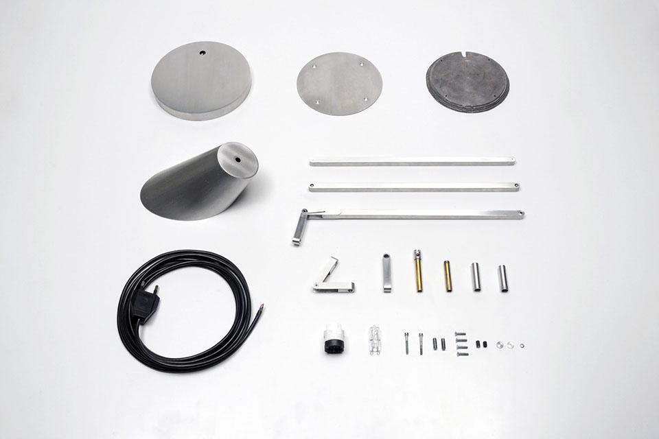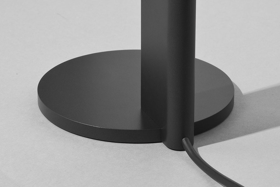 The aluminium body contains all electronic components like the transformer in order to keep the power plug clean and the overall appearance subtle. a sturdy posture while showing a visible contrast to the delicate shade that is seemingly balancing on an angular top.